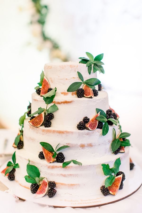 wedding cake with blackberries and figs, green leaves. rustic style. food on a board.